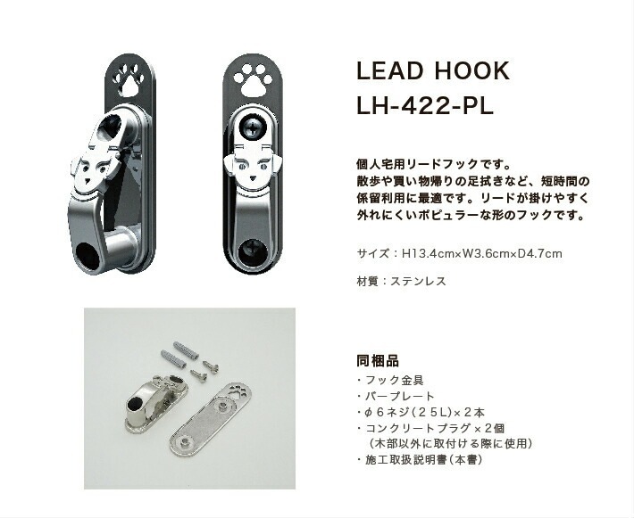 個人宅用リードフックです。散歩や買い物帰りの足拭きなど、短時間の係留利用に最適です。お散歩バックなどの収納にも使えます。リードが掛けやすく外れにくいポピュラーな形のフックです。