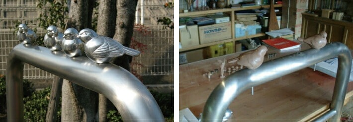 村中氏は、街でよく見かける金属製の小鳥たちの生みの親でもあります。